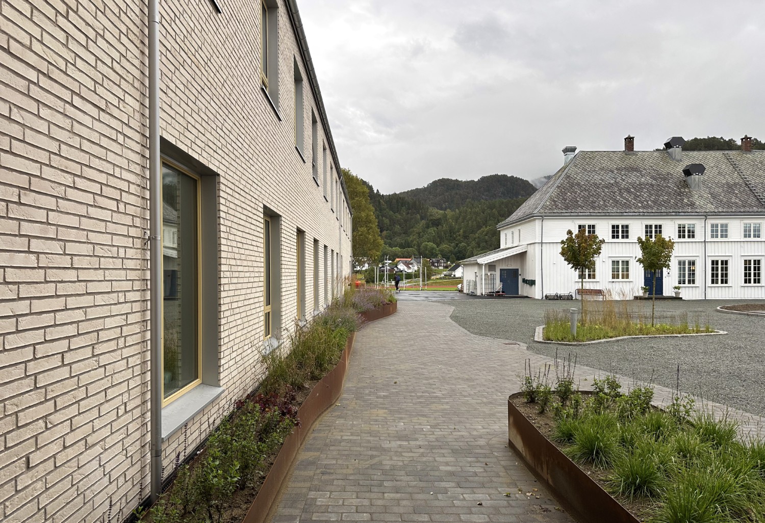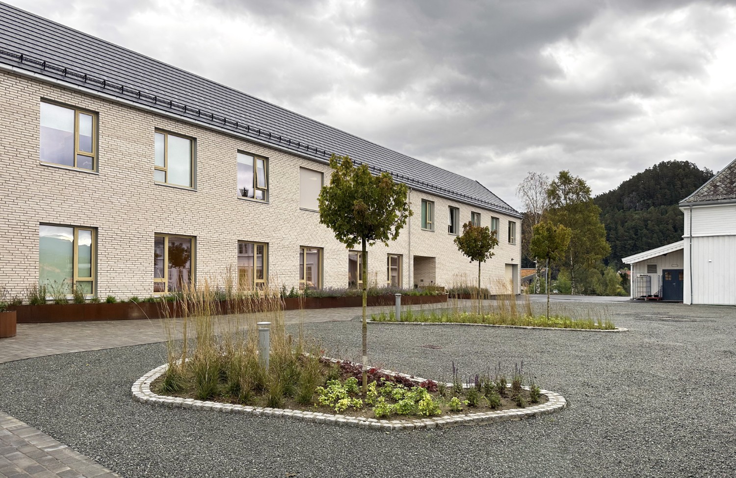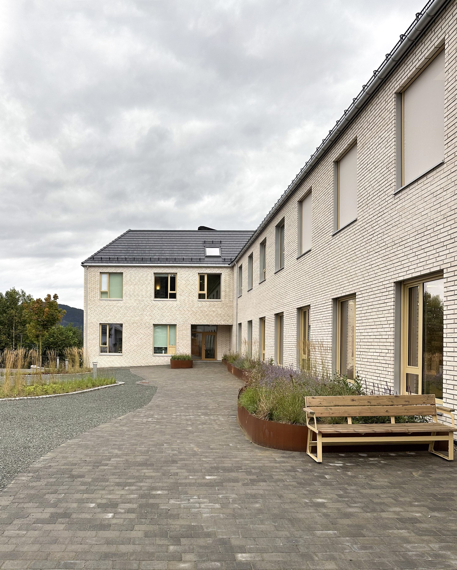Fasadeutrykket er tilpasset det eksisterende bygningsmiljøet gjennom proporsjoner på vinduer, rytme og fargepalett. Takformen er også tilpasset omgivelsene gjennom liknende takvinkel og geometri, samtidig som det tilrettelegger for skjulte solcellepanel. Bygget ferdigstilles til skolestart 2025.