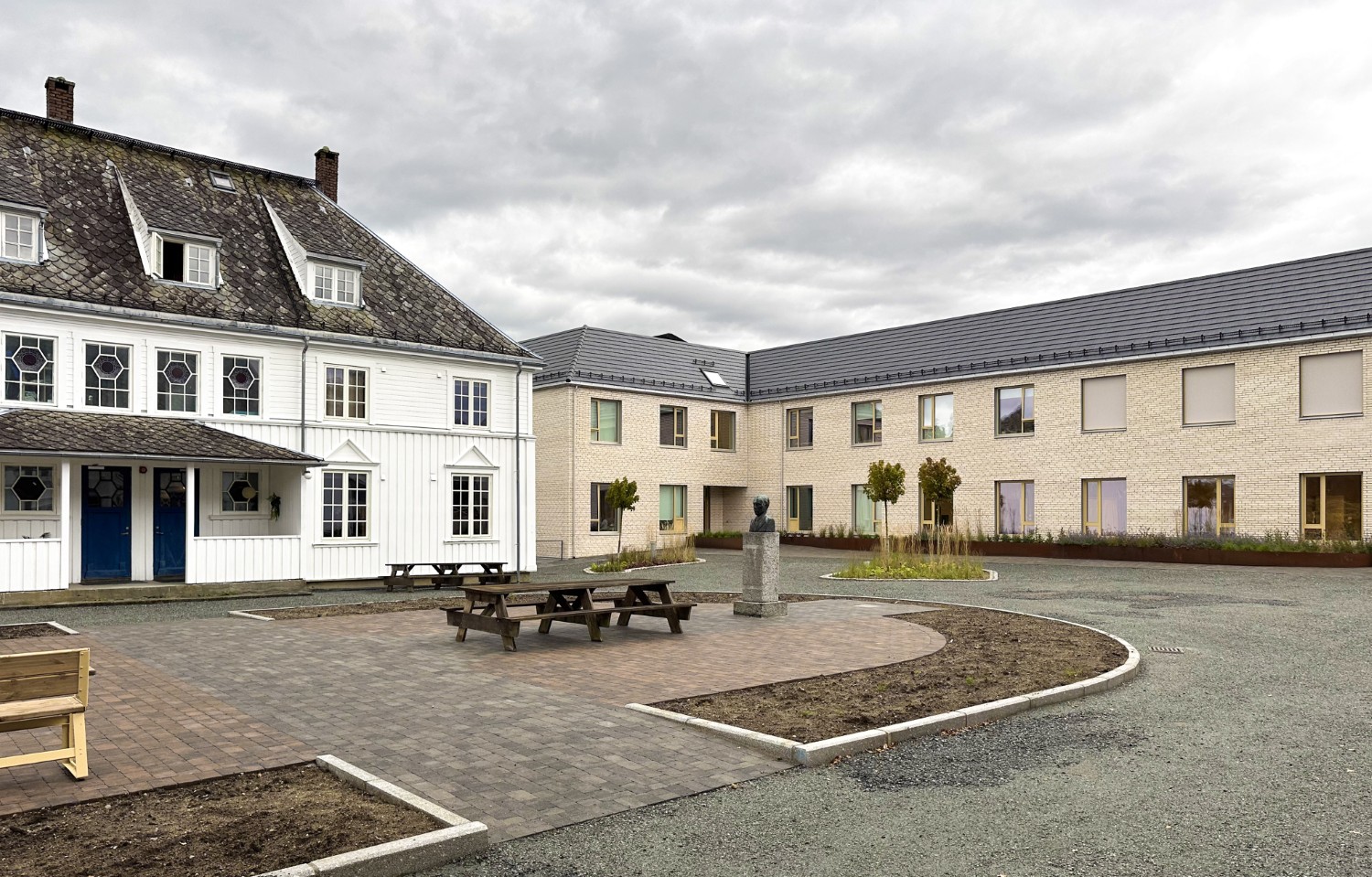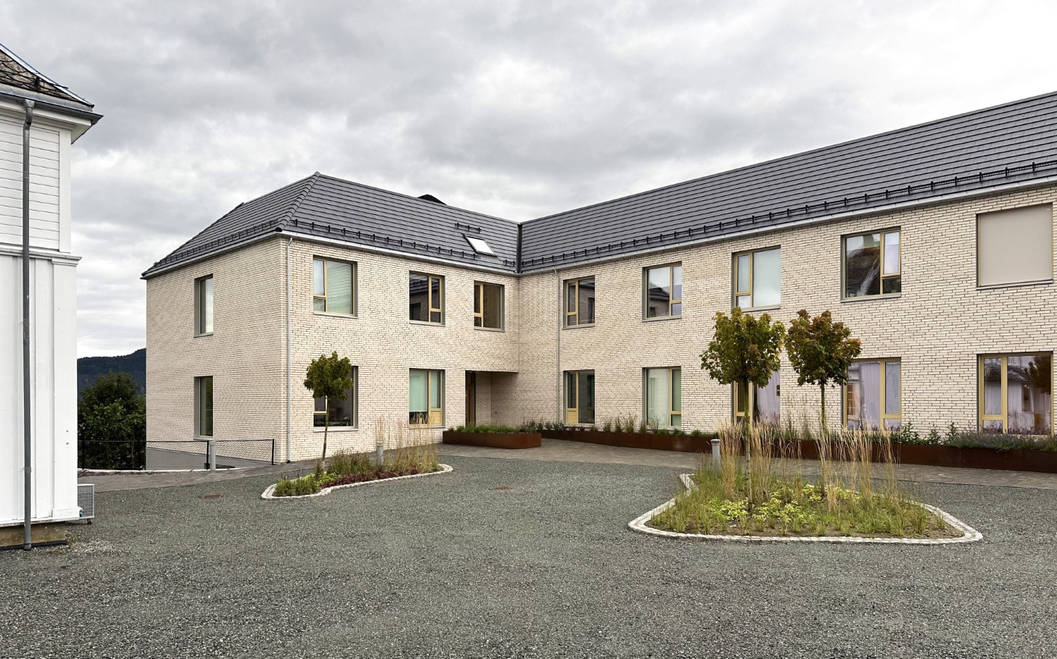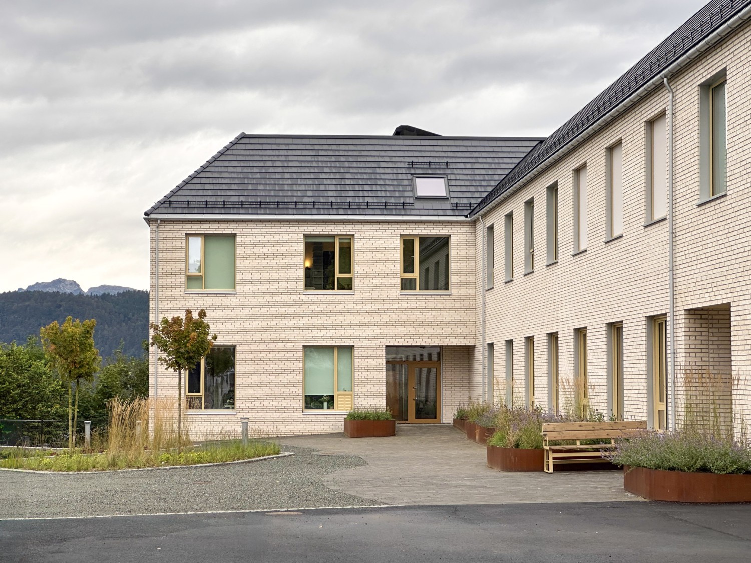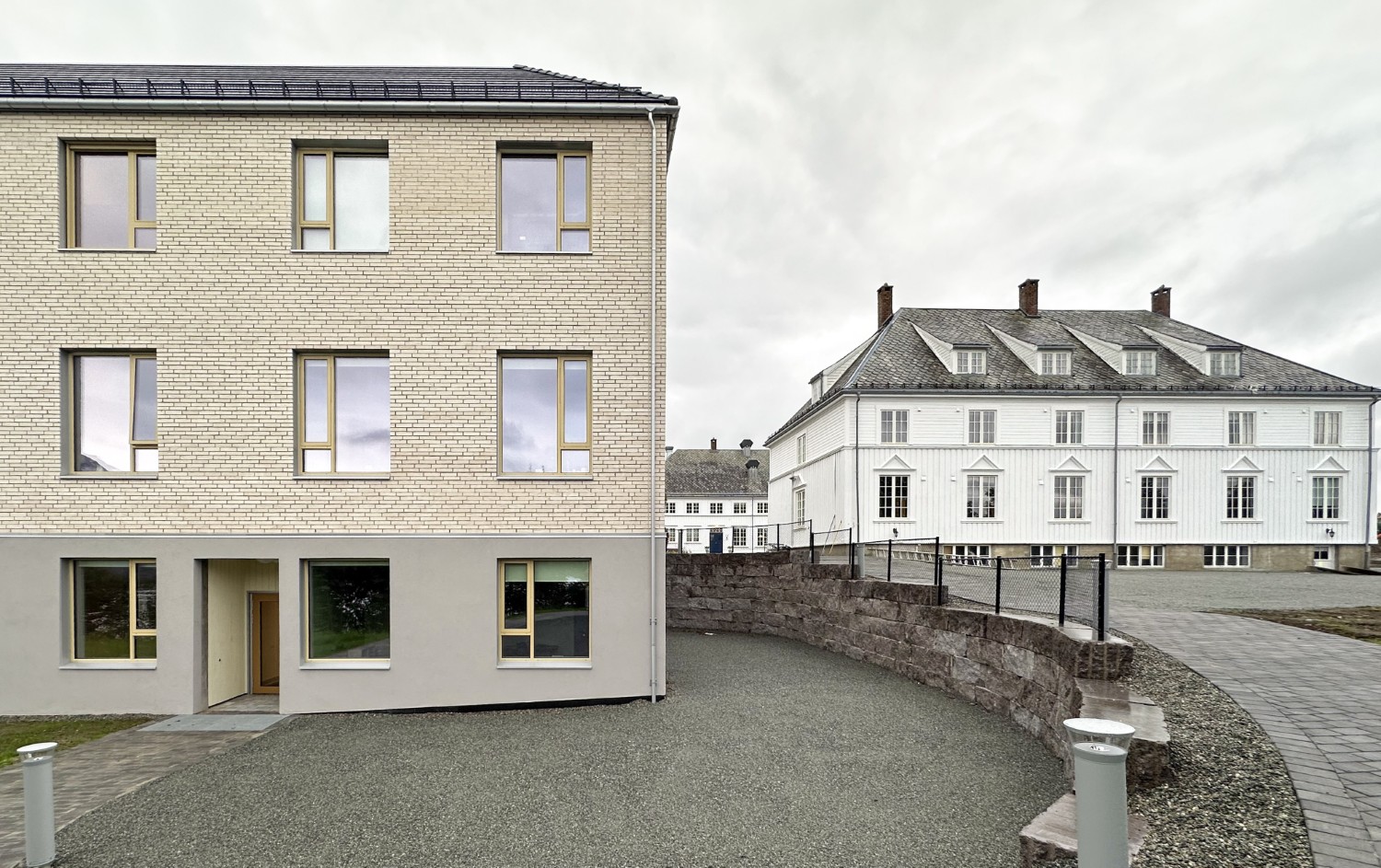 Fasadeutrykket er tilpasset det eksisterende bygningsmiljøet gjennom proporsjoner på vinduer, rytme og fargepalett. Takformen er også tilpasset omgivelsene gjennom liknende takvinkel og geometri, samtidig som det tilrettelegger for skjulte solcellepanel. Bygget ferdigstilles til skolestart 2025.